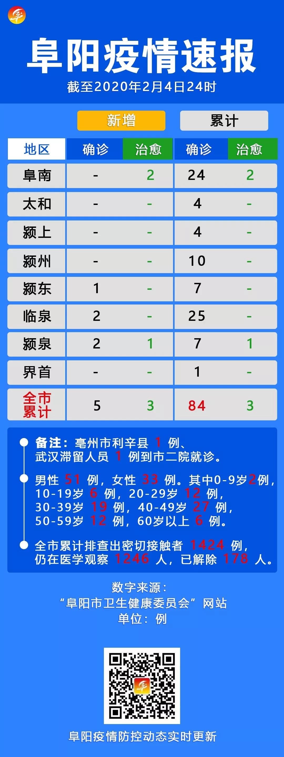 確診病例80(編號(hào)0204-1):韓某某,男,29歲,現(xiàn)住址臨泉縣張營(yíng)鄉(xiāng)。1月21日從武漢開車返回臨泉,1月24日發(fā)病,1月25日至臨泉縣人民醫(yī)院就診,2月1日轉(zhuǎn)送至阜陽(yáng)市第二人民醫(yī)院隔離治療,2月4日確診,目前病情穩(wěn)定。
