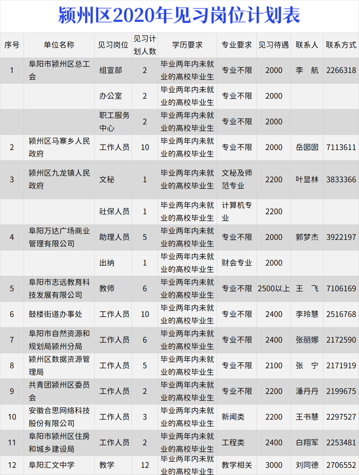 為解決高校畢業生和失業青年就業問題,提高社會實踐能力,掌握就業技能,盡快實現就業。根據《安徽省就業工作領導小組關于印發應對新冠肺炎疫情影響強化穩就業工作若干政策的通知》(皖就〔2020〕6號)和《關于印發潁州區2020年就業創業促進民生工程實施辦法的通知》(阜州就辦〔2020〕2號)精神,現將就業見習空缺崗位公告如下: