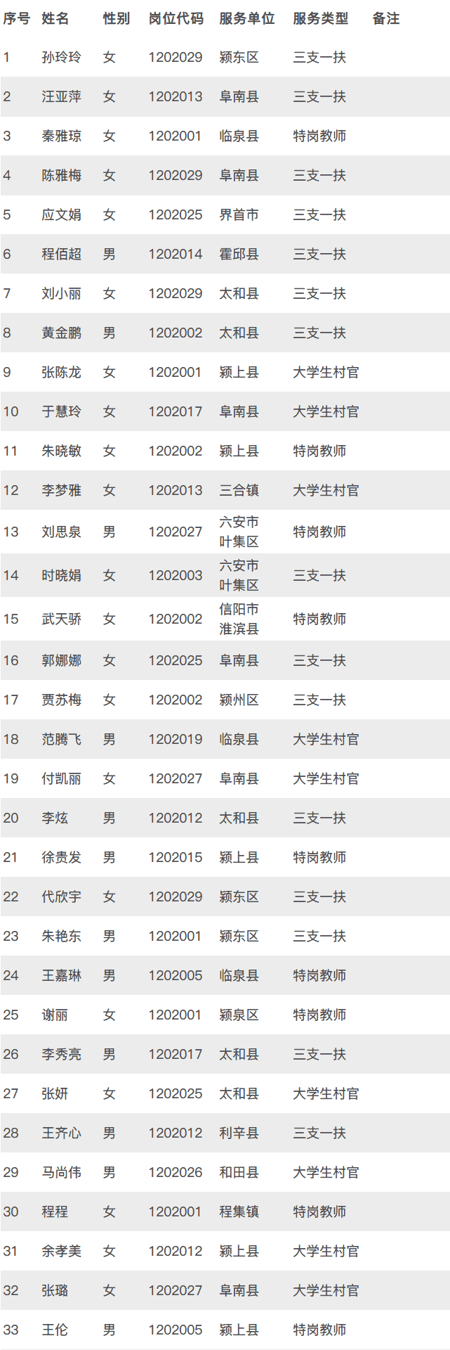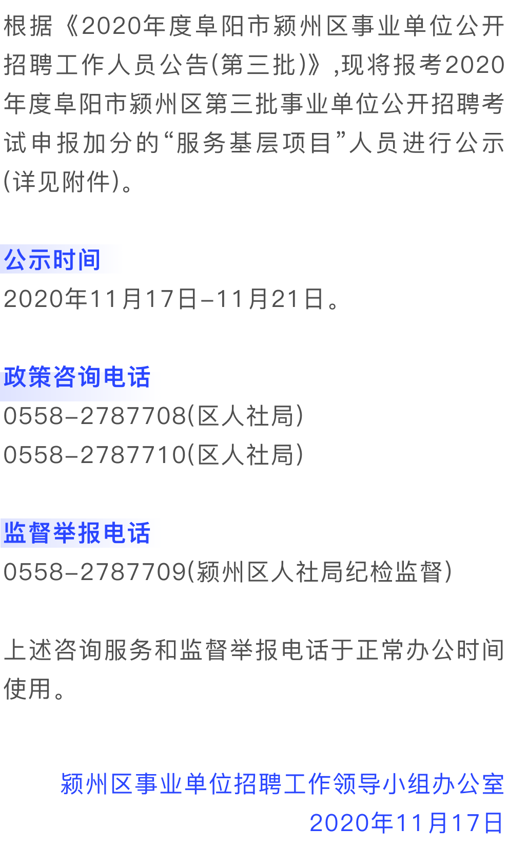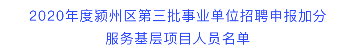 2020年度阜陽市潁州區第三批事業單位公開招聘申報加分“服務基層項目”人員公示