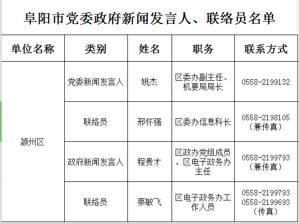 潁州區黨委政府新聞發言人、聯絡員名單公示