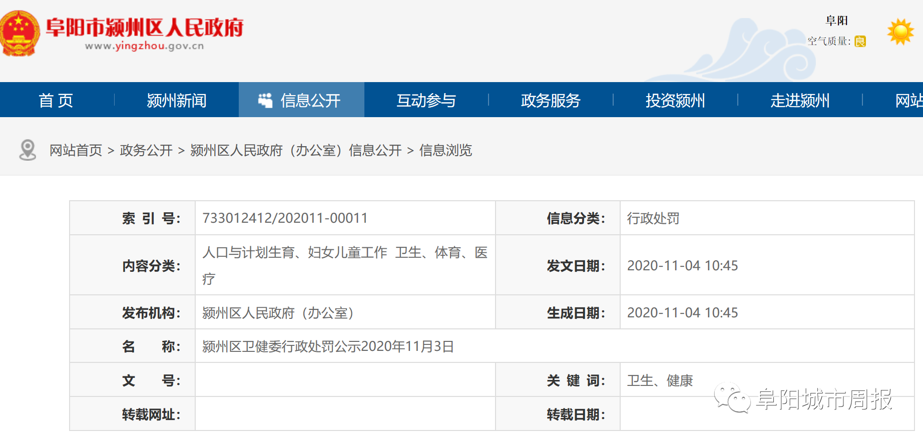 潁州區(qū)衛(wèi)健委行政處罰公示