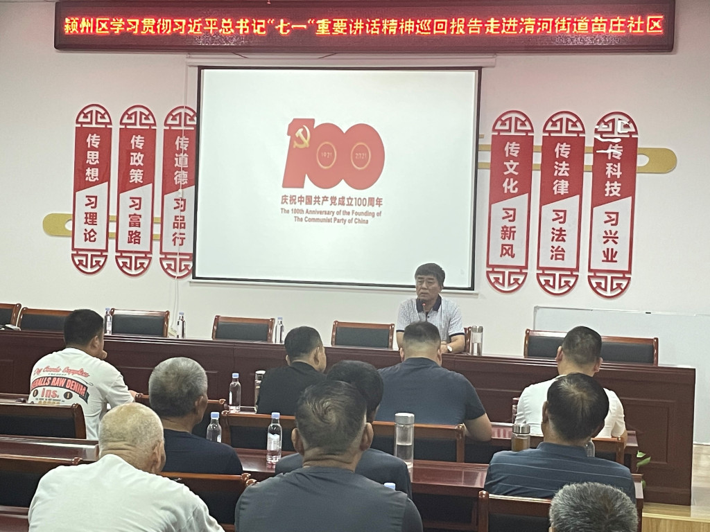 2021年7月21日下午,潁州區學習貫徹習近平總書記“七一”重要講話精神巡回報告走進清河街道苗莊社區,全國優秀基層黨務工作者、西湖景區街道黨工委委員、九龍鎮黨工委委員、五坑村黨總支書記閆永志,區骨干宣講團成員、區委黨校優秀青年教師田苗苗作報告。會議由苗莊社區新時代文明實踐站負責人員朱濤濤主持,社區黨員、居民代表50余人參加會議。