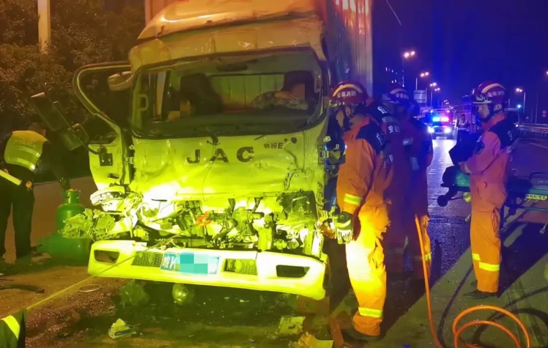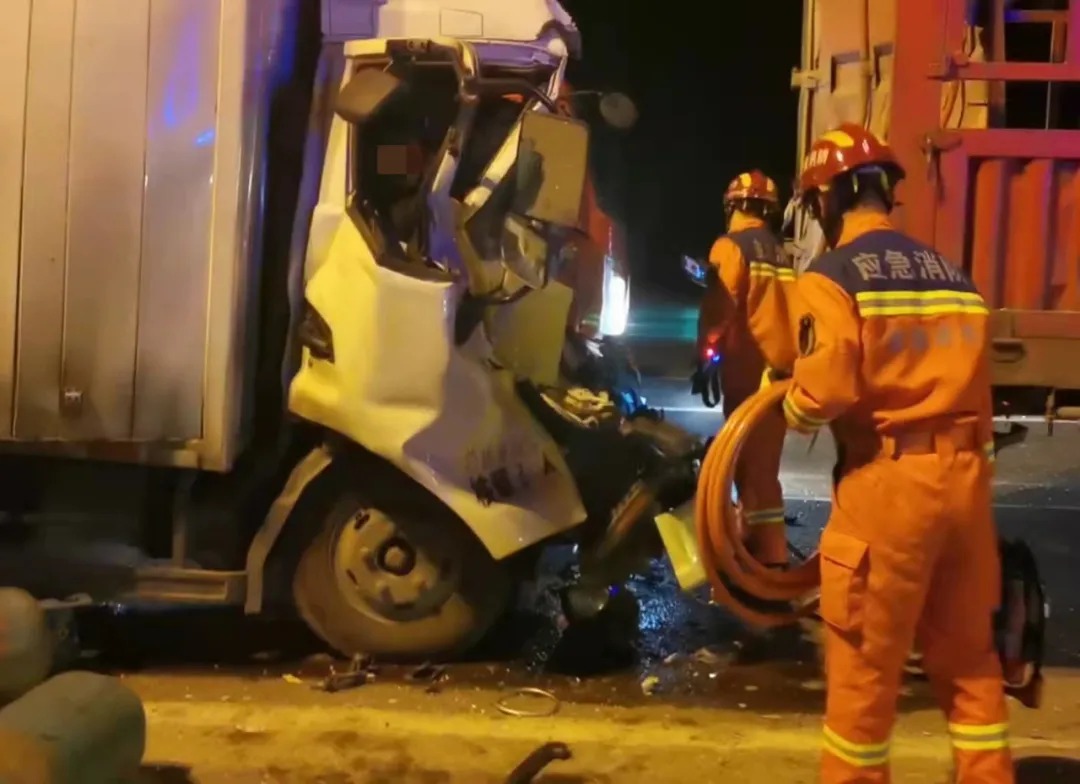 只見一輛箱貨追尾一輛半掛車車內兩人被變形車體卡住無法脫身