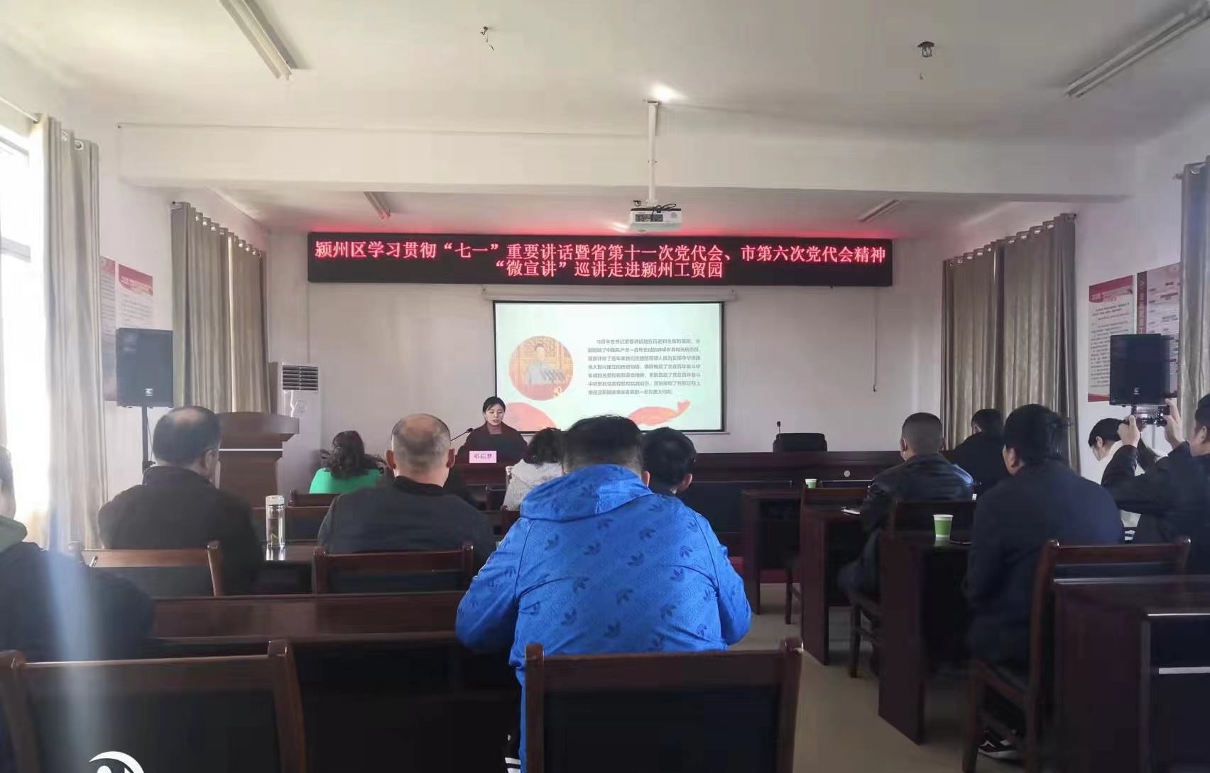 11月8日上午,潁州區(qū)學習貫徹習近平總書記“七一”重要講話暨省第十一次、市第六次黨代會精神微宣講走進潁州工貿(mào)園管委會,企業(yè)黨員、職工代表、園區(qū)機關(guān)全體人員共30余人參加學習。
