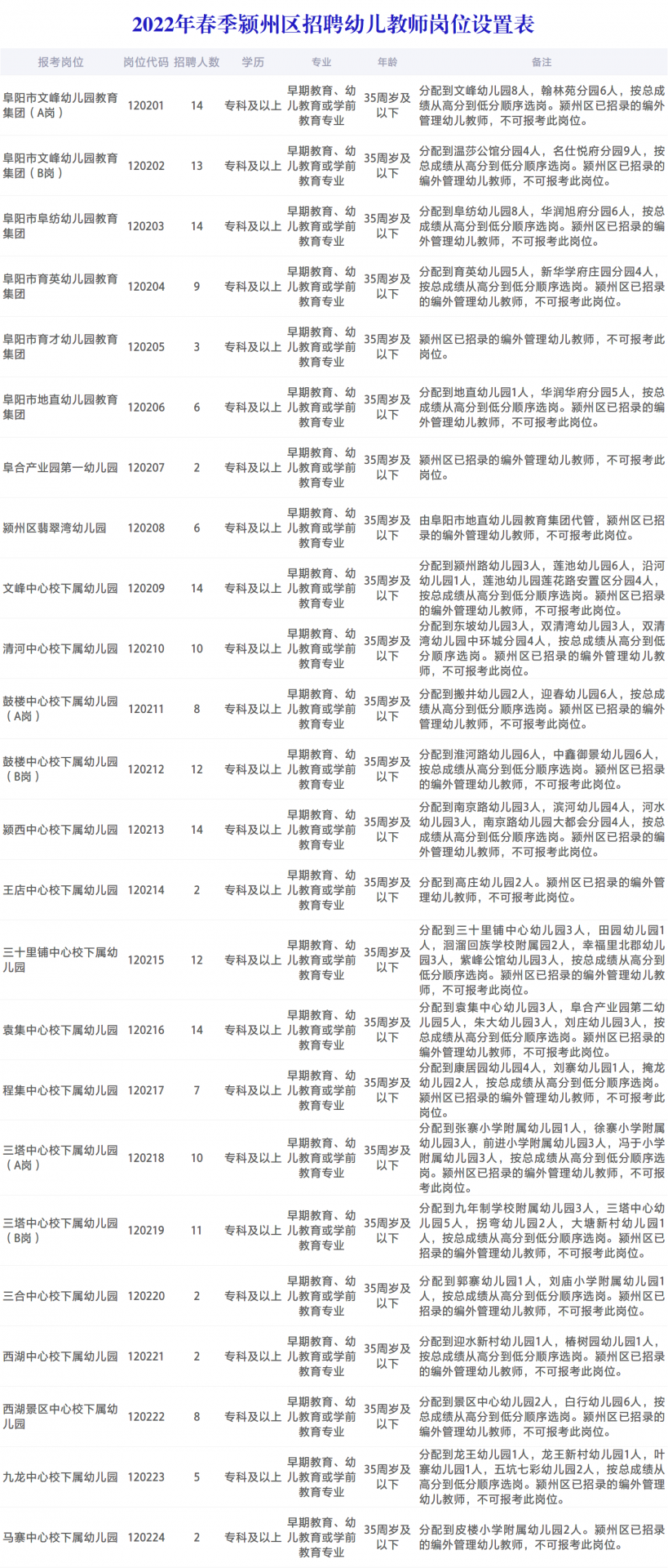 為加強全區幼兒教師隊伍建設,促進學前教育科學健康發展,經研究,決定面向社會公開招聘幼兒教師200名,現將有關事宜公告如下: 堅持“民主、公開、競爭、擇優”的原則,按照德才兼備的標準,實行考試、考察相結合的方式進行。 招聘幼兒教師200名。 (一)必備條件 1.具有中華人民共和國國籍,擁護中國共產黨的領導,遵紀守法,品行端正,熱愛教育事業,具有開拓進取精神和服務意識,具備良好的職業道德。 2.具備國家承認的大學專科及以上學歷,早期教育、幼兒教育或學前教育專業,現已取得畢業證書。 3.具備幼兒園教師資格證。已通過教師資格筆試、面試尚未取得幼兒園教師資格證書的人員可以報考,但須于2022年7月30日前取得幼兒園教師資格證書(或證書編號),否則取消聘用資格。 4.普通話須為二級甲等及以上。 5.身心健康,符合《安徽省教師資格申請人員體檢標準及辦法》(教人[2001]35號)、《關于進一步做好教師資格認定體檢工作的通知》(皖教師[2011]1號)規定。 6.年齡:35周歲及以下,即1986年1月17日(含)以后出生。 7.符合招聘崗位所需的其他資格條件。 (二)有下列情形的人員,不得報考: 1.不符合崗位招聘條件的人員; 2.未取得畢業證書的高校生; 3.現役軍人; 4.經政府教育部門、人力資源和社會保障部門認定具有考試違紀行為且在停考期內的人員; 5.曾因犯罪受過刑事處罰的人員和曾被開除公職的人員、受到黨紀政紀處分期限未滿或者正在接受紀律審查的人員、處于刑事處罰期間或者正在接受司法調查尚未做出結論的人員; 6.按照國家、省有關規定,尚在最低服務年限內的機關、事業單位正式在編工作人員; 7.法律規定不得參加報考或聘用為事業單位工作人員的其他情形人員。 報考者不得報考聘用后即構成《事業單位人事管理回避規定》第六條所列情形的崗位。 (一)網上報名 1.報名方式和報名時間 本次招聘報名采用網絡報名方式,報名網站為http://wxpta.ahwxhr.com。報考人員提交報名申請的統一時間為2022年1月16日8:00至1月20日17:00, 逾期不再補報。 報考人員報名前,應通過“皖事通”APP實名申領“安康碼”,考生在全部招聘過程中必須遵守新冠肺炎疫情防控的相關規定和要求。 2.報名需錄入的信息 報考人員登錄http://wxpta.ahwxhr.com進行報名,簽署“誠信承諾書”,按照要求填寫個人基本情況、教育經歷等信息,上傳本人電子照片(照片要求),并提供有效通訊方式。 3.有關要求 (1)報考人員所填寫的信息必須真實、準確、完整,并與所招考崗位資格條件要求一致。凡弄虛作假者,一經查實,取消考試、聘用等資格。 (2)每位報考人員限報一個崗位,并使用本人同一有效居民身份證進行報名和參加考試。 (二)網上資格審查 1.報考人員進行網上報名的同時,區人社局、教育局對照招聘條件逐人進行資格審查,于1月21日11:30前完成。 2.報考人員報名后于1月21日11:30前,可隨時登錄報名網站查詢是否通過資格審查。通過資格審查的,不得改報其他崗位;尚未審查或未通過資格審查的可在1月21日11:30前改報。 (三)報名確認 1.通過資格審查的報考人員可登陸報名網站通過銀行支付平臺繳納筆試費用,進行報名確認。繳費截止日期為1月21日23:00(逾期未繳費的視為自行放棄)。 2.根據安徽省財政廳、安徽省物價局財綜〔2013〕2568號文件規定,按每人每科45元的標準收取筆試費用。 3.資格審查并網上繳費結束后,報考同一崗位的應聘人數與招聘崗位計劃數之比應不低于2:1,不足規定開考比例的,取消或相應核減該崗位計劃數。所報崗位因報名人數不足被取消的,報考人員可在1月22日12:00至17:00 進行一次改報,逾期不再受理,對于改報的報考人員,于1月22日17:00前完成資格審查。 (四)打印準考證 報考人員于1月25日9:00至1月27日17:00前,直接從報名網站下載并打印準考證,按準考證上指定的時間、地點,攜帶準考證、本人有效身份證及本人參加考試開考前48小時內(以采樣時間為準)新冠病毒核酸檢測陰性證明(紙質版),按照規定的時間到考點參加筆試。考生“安康碼”為綠碼,行程碼無異常,且經現場測量體溫低于37.3℃,并無干咳等異常癥狀的,方可進入考點參加考試。 請報考人員務必在規定日期打印準考證,以免錯過考試時間。 (五)筆試 1.筆試科目和內容 (1)筆試科目:《教育公共基礎知識》和《學前教育專業知識》兩科。 (2)筆試內容:《教育公共基礎知識》為教育學、心理學、教育法律法規等;《學前教育專業知識》為幼兒學科專業知識。 2.筆試成績計算 筆試每科滿分為100分,按《教育公共基礎知識》占30%、《學前教育專業知識》占70%合成筆試成績,在統計過程中均保留小數點后兩位,四舍五入。設定筆試合成成績最低分數線為60分,達不到最低分數線的,或考生有一科無成績的,取消進入下一環節資格。 3.筆試時間及地點 (1)考試時間:2022年1月28日。 其中:8:30-10:00《教育公共基礎知識》、10:00-12:00《學前教育專業知識》。 (2)考試地點:見準考證。 (六)現場資格復審 現場資格復審工作由區人社局、區教育局具體負責,資格復審對象為擬參加專業測試人員,從高分到低分按崗位招聘計劃數確定進入專業測試人員,其中崗位招聘計劃數5人及以下的按3:1比例確定,崗位招聘計劃數5人以上的按2:1確定,最后一名如有多名報考人員成績相同的,并列進入。 資格復審不合格或未按時參加現場資格復審的,取消