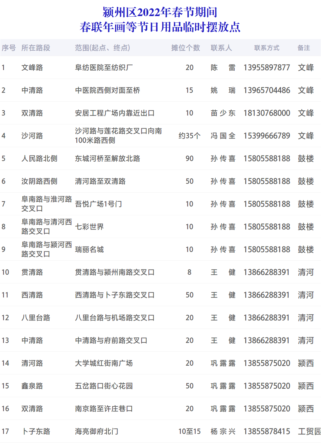 考慮到市民的實際需求,為方便市民購買春聯、年畫等節日用品,潁州區2022年春節期間節日用品臨時擺放點設置如下: