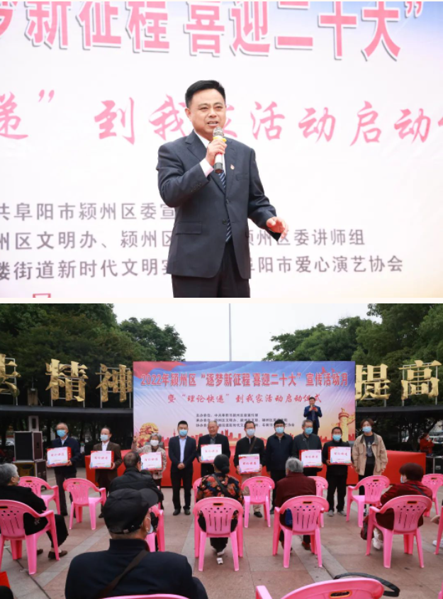 5月13日上午,潁州區(qū)“逐夢(mèng)新征程 喜迎二十大”暨“理論快遞”到我家宣傳宣講活動(dòng)啟動(dòng)儀式在鼓樓廣場(chǎng)成功舉辦。區(qū)委宣傳部、文明辦、鼓樓街道等單位相關(guān)負(fù)責(zé)人參加了啟動(dòng)儀式。