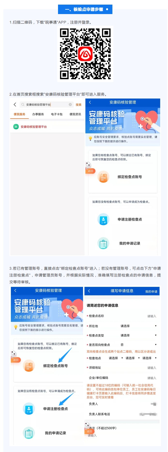 一、規范設置“場所碼”。全區各重點社會服務和管理機構、商貿場所、服務業場所、公共場所、公共交通工具以及小區等居民活動場所,必須設置場所碼,為規范使用和統計掃碼情況,原則上每個單位、獨立場所設置1個場所碼,區域較大,比較分散的單位和場所可根據需要設置多個場所碼。場所碼應張貼于出入口等醒目位置,無場所碼的立即在“皖事通”APP進行申請。