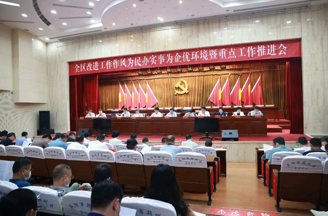 6月20日,潁州區召開改進工作作風、為民辦實事、為企優環境暨重點工作推進會議。阜陽經開區黨工委書記、管委會主任,區委書記段相霖出席會議并講話,區委副書記、區長劉峰主持會議。