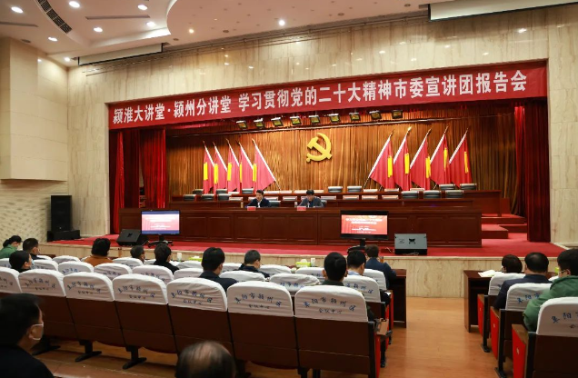 根據市委統一部署,11月16日上午,學習貫徹黨的二十大精神市委宣講團報告會暨潁州區委中心組學習(擴大)會舉行。市委宣講團成員、市委組織部常務副部長高文軍作宣講報告。區委副書記、區長劉峰主持報告會并講話。呂登虎、汪國兵、賀瑾、單迎娜、梁峰、程連濤等區委中心組成員及其他區級負責同志出席會議。各鄉鎮街道黨(工)委書記、宣傳委員,區直各單位主要負責人及部分潁州區宣講員代表參加會議。