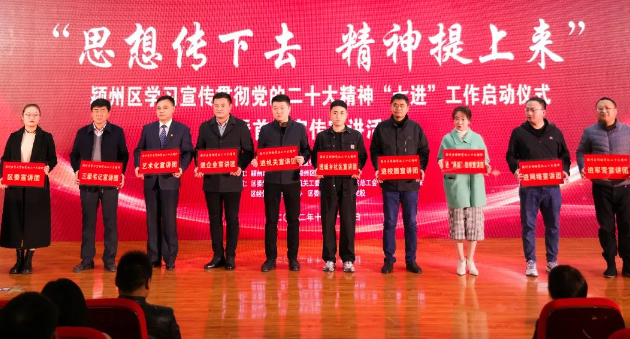 梁峰在致辭中說,“思想傳下去 精神提上來”——潁州區(qū)學(xué)習(xí)宣傳貫徹黨的二十大精神“七進(jìn)”工作是我區(qū)貫徹落實(shí)黨中央部署及省委、市委要求的實(shí)際行動,是推動黨的二十大精神宣傳全覆蓋的有效抓手。承擔(dān)宣講任務(wù)的單位要提高政治站位,提升宣講高度,切實(shí)把黨的二十大確定的主題主線、“三個務(wù)必”、“五個牢牢把握”、中國式現(xiàn)代化等重要內(nèi)容宣傳宣講到位,以黨的二十大精神統(tǒng)一思想、凝聚人心、鼓舞斗志。要拓寬宣講廣度,通過“七進(jìn)”工作,用心用情講好黨的二十大故事,推動黨的二十大精神家喻戶曉、深入人心。要加大宣講力度,各級領(lǐng)導(dǎo)干部要帶頭學(xué)習(xí)、帶頭宣講、帶頭貫徹黨的二十大精神,帶頭上講臺、走基層,一級帶著一級講、一級帶著一級干。要夯實(shí)宣講厚度,注重宣講成果轉(zhuǎn)化,突出實(shí)干實(shí)效,把黨的二十大作出的重大決策部署付諸于行動、見之于成效,踔厲奮發(fā)、勇毅前行,爭當(dāng)學(xué)習(xí)宣傳貫徹黨的二十大精神“排頭兵”,以實(shí)干擔(dān)當(dāng)創(chuàng)優(yōu)異成績,為新階段建設(shè)幸福美麗潁州奏響“最強(qiáng)音”。