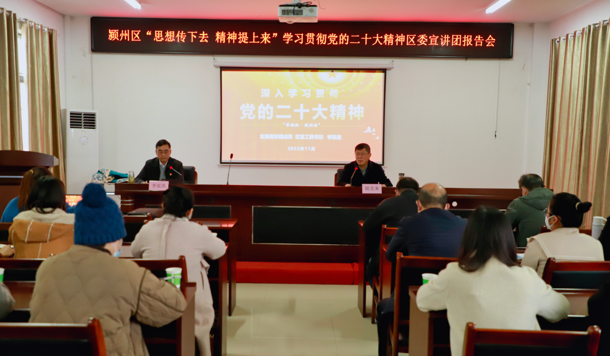為深入學習貫徹黨的二十大精神,根據區委宣傳部安排部署,11月28日,區直工委書記李泓浩赴潁州工貿園開展潁州區“思想傳下去 精神提上來”學習貫徹黨的二十大精神區委宣講團報告會。園區企業黨員、職工代表,機關全體人員參加了宣講會。