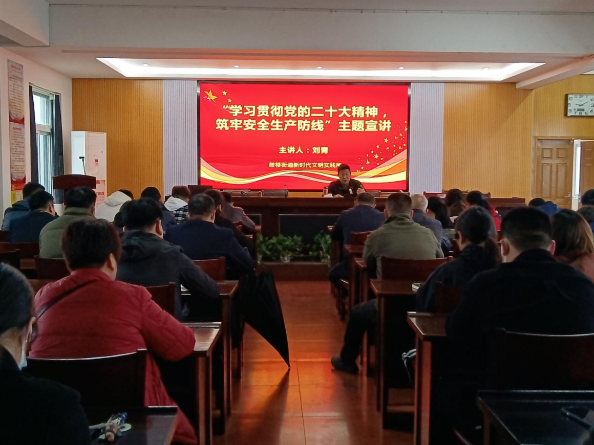 為深入學(xué)習(xí)貫徹黨的二十大精神,提高公共安全治理水平,進(jìn)一步增強(qiáng)轄區(qū)居民安全生產(chǎn)意識,預(yù)防和減少安全事故的發(fā)生。4月23日,鼓樓街道新時代文明實踐所開展“學(xué)習(xí)貫徹黨的二十大精神 筑牢安全生產(chǎn)防線”主題宣講活動,社區(qū)安全員、轄區(qū)物業(yè)公司法人和安全負(fù)責(zé)人、居民群眾代表參與宣講。