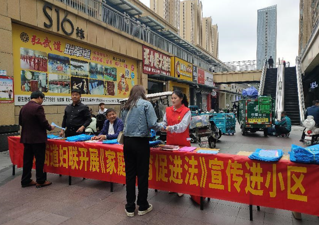 工作人員向小區居民普及《家庭教育促進法》中“家庭責任”等相關內容,向家長明確其家庭教育是父母或其他監護人為促進未成年人健康成長,對其實施道德品質、身心健康等方面。