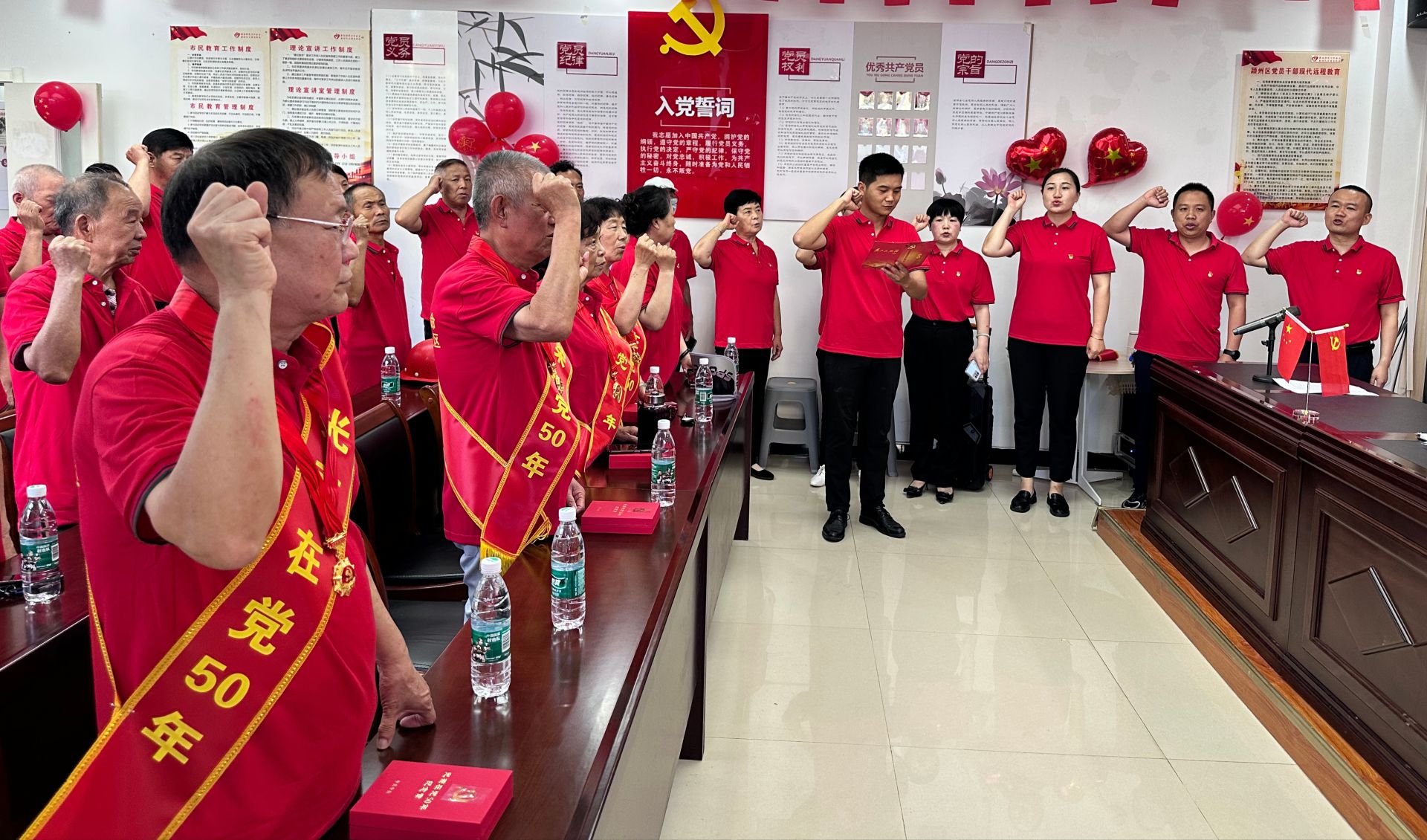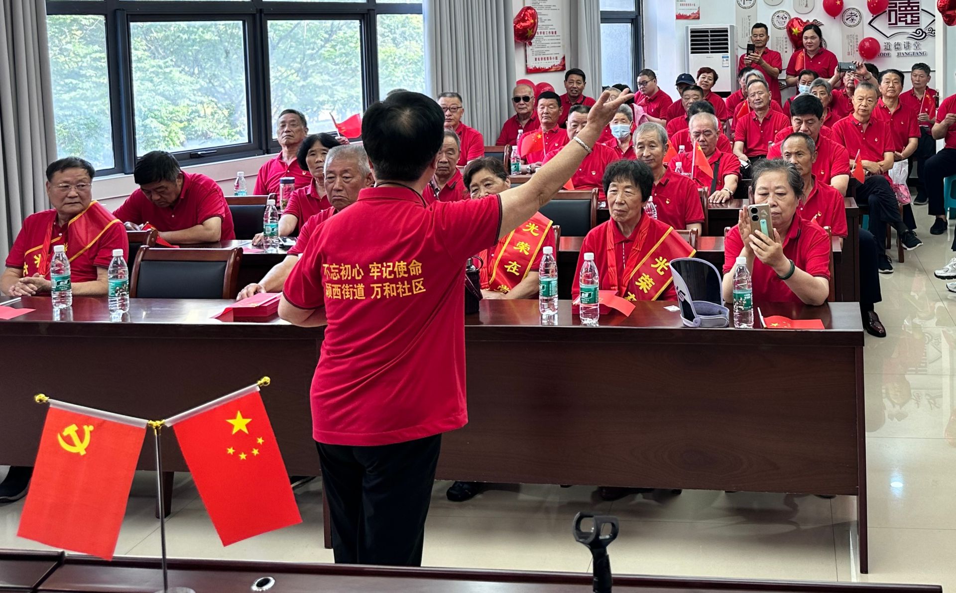 主題活動(dòng)為蒲學(xué)忠等4位黨齡達(dá)到50周年的老黨配戴了金燦燦的“光榮在黨50年”紀(jì)念章,向他們致以誠摯慰問和崇高敬意。社區(qū)黨總支副書記周子洋為黨員們上了一堂“賡續(xù)優(yōu)良傳統(tǒng)、傳承紅色記憶”主題黨課,黨員們共同唱響《黨員干部就要不怕吃虧》、大合唱《沒有共產(chǎn)黨就沒有新中國》等紅色歌曲,展現(xiàn)出了萬和社區(qū)黨員不忘初心、積極向上的精神風(fēng)貌。