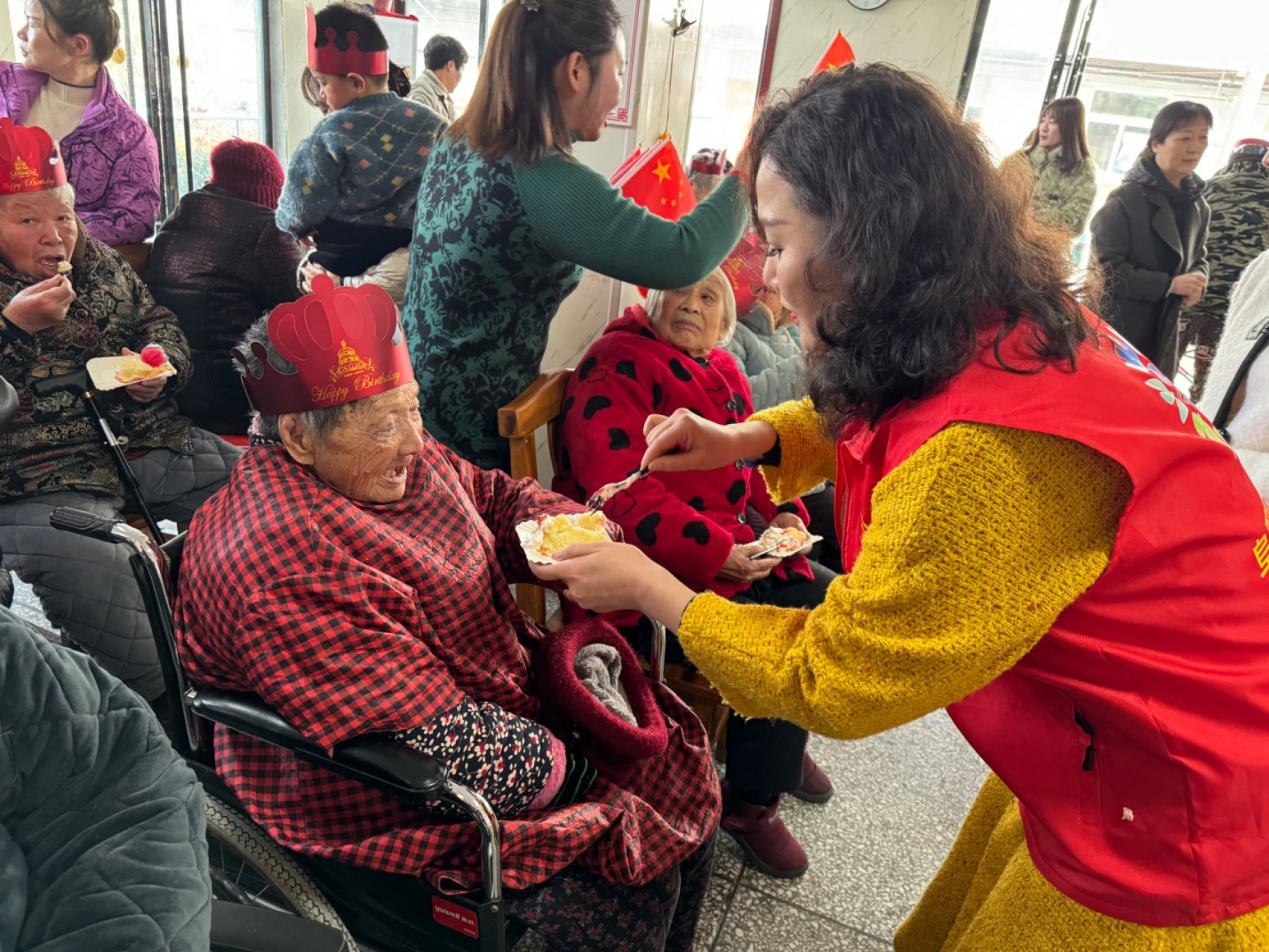 慰問演出結束后,志愿者們給本月份過生日的老壽星們送上生日蛋糕,點燃生日蠟燭,唱起《生日快樂》歌,祝愿他們身體健康,心情愉快,福壽延年,幸福美滿!