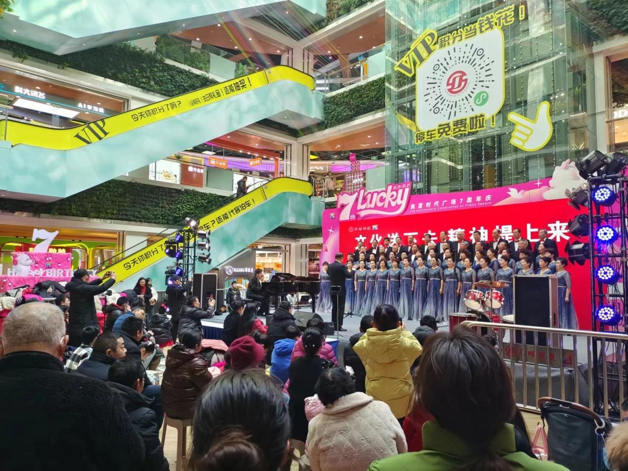 1月20日上午,阜陽潁州區(qū)商廈時代廣場一樓大廳,歌聲悠揚、樂曲歡樂浮動,觀眾們應(yīng)和鼓掌叫好。