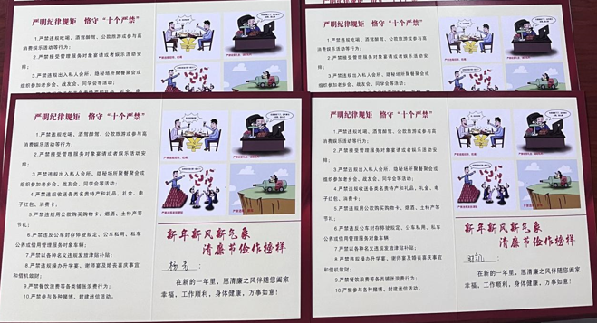 這張以“新年新風新氣象,清廉節儉做榜樣”為主題的廉潔卡,不僅傳遞了對全鎮干部職工及家屬的誠摯祝福,還通過圖文并茂的形式生動展現了清廉“十嚴禁”。小小的卡片,字字情真意切,句句發自肺腑,寄托了對黨員干部們的關懷與鞭策,提醒他們在溫馨過節時,要守住底線、不越紅線,抵制“節日病”侵蝕,用自己的一言一行,營造清正廉潔、風清氣正、歡樂祥和的新春氛圍。