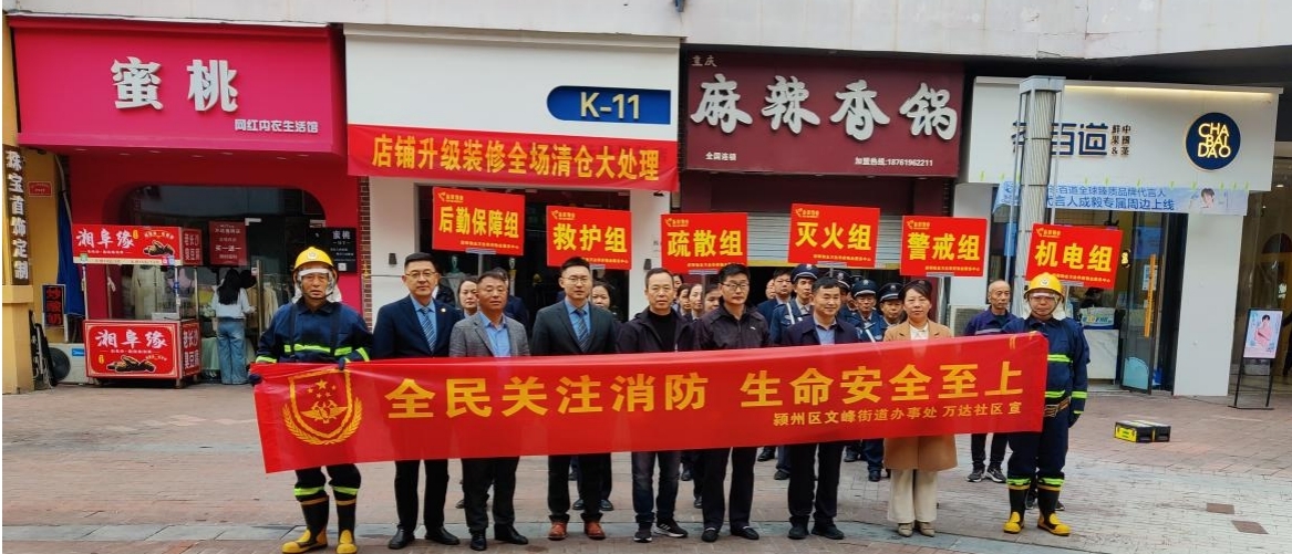 為進一步提升居民的防火意識,有效防范和堅決遏制各類火災事故發生,在全國消防安全宣傳月到來之際,潁州區文峰街道萬達社區11月9日上午在萬達商業街開展“全民關注消防 生命安全至上”消防安全演練活動。文峰街道黨工委委員宋金友、萬達社區工作人員和商業街商戶負責人參與本次演練。
