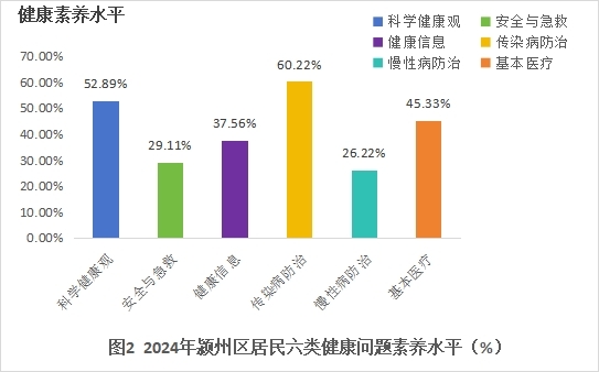 在六類健康問題素養水平上,由高到低依次為:傳染病防治素養60.22%、科學健康觀素養52.89%、基本醫療素養45.33%、健康信息素養37.56%、安全與急救素養29.11%、慢性病防治素養26.22%。值得一提的是,各類問題素養水平均有不同程度的提升,其中傳染病防治水平的增幅最為明顯。通過連續多年的監測不難發現,潁州區居民的健康素養水平正逐年穩步提升,并且已提前達成2030年居民健康素養水平達到30%的目標。這一成果離不開政府的主導、各部門的協作以及群眾的共同努力,使得群眾的健康意識和健康生活方式不斷改善,居民健康知識知曉率也持續提高。