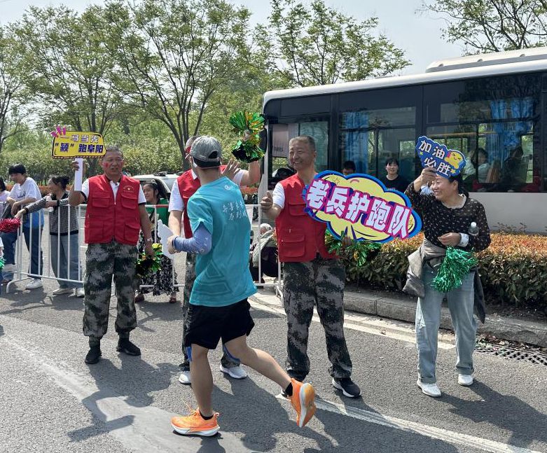在西湖大道第35號加油站匯聚了50余名潁州區退役軍人志愿者,他們手舉加油牌,喊著激情四射的加油口號,以飽滿的精神狀態鼓舞著每一名經過的參賽選手。退役軍人志愿者們時而激情吶喊、時而軍歌嘹亮,激勵選手超越極限、永不放棄,取得更好的成績。