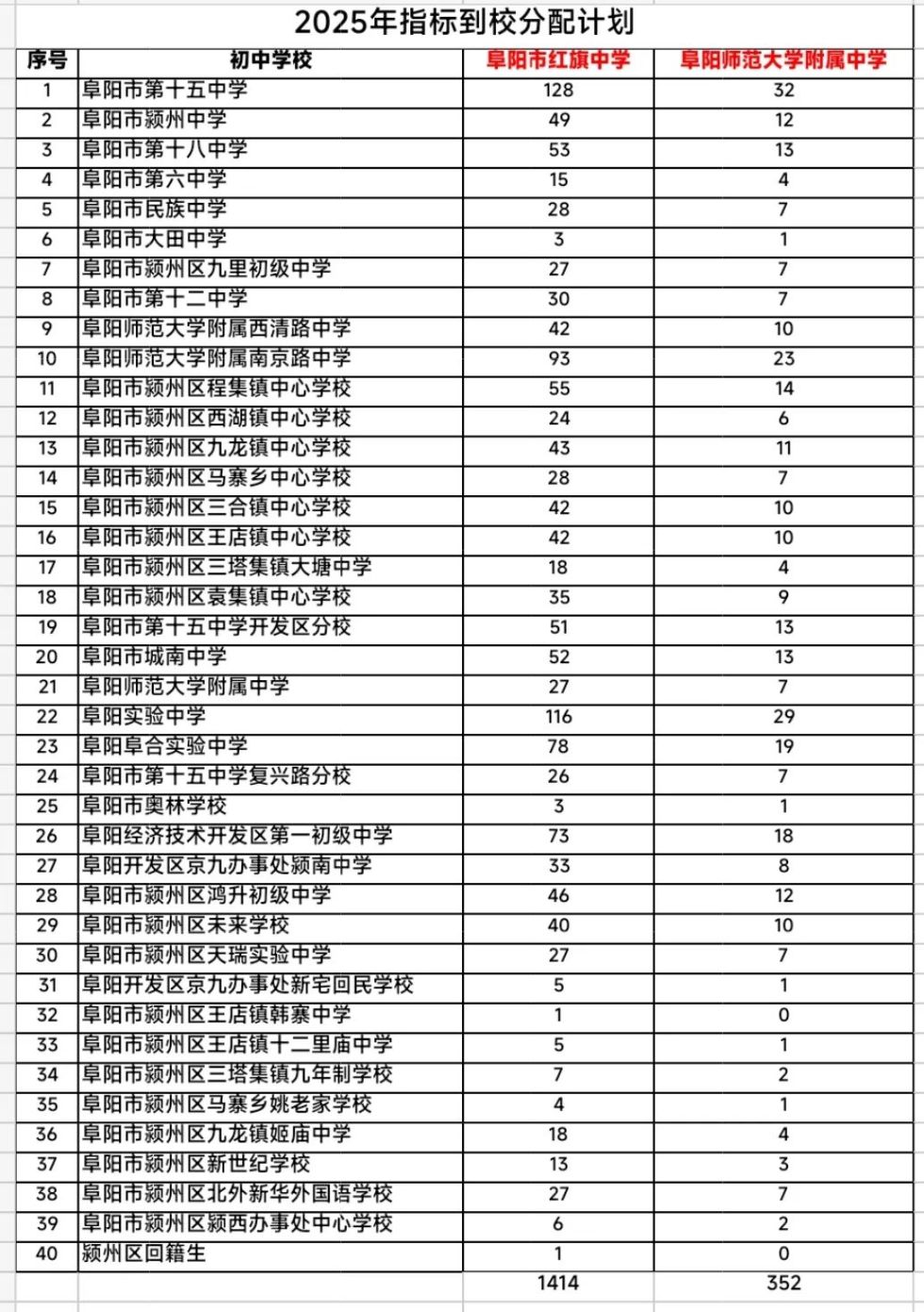根據《安徽省教育廳關于做好2025年普通中小學招生入學工作的通知》《關于做好2025年阜陽市省示范高中指標到校資格審核及分配等工作的通知》《阜陽市教育局關于下達2025年市直省示范高中指標到校生分配計劃的通知》精神,現將潁州區區屬省示范高中和評估優秀的市示范高中指標到校生按照學校招生計劃80%切塊分配到潁州區各初中學校(具體見附件)。請你們結合實際,做好政策宣傳,確保招生工作平穩有序。