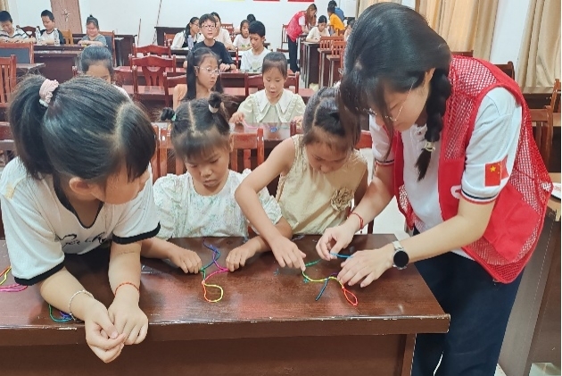7月8日上午,志愿者便為孩子們帶來了一堂富有傳統文化特色的中國結編織課。課程以“巧編中國結,傳承文化情”為主題,通過互動教學帶領孩子們體驗非遺技藝的魅力。
